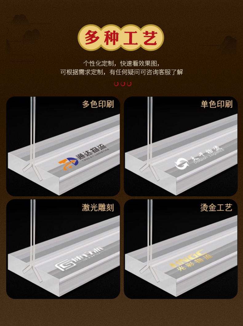 礼品表面烫上色箔等材料的文字和图案(有色彩),有无色烫印,单色烫印,混合式烫印和套印等。