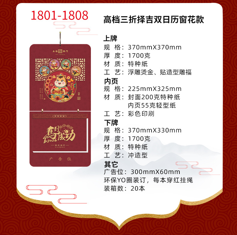 2026马年大六开黄历挂历新年喜庆福字吊牌烫金广告企业宣传厂家