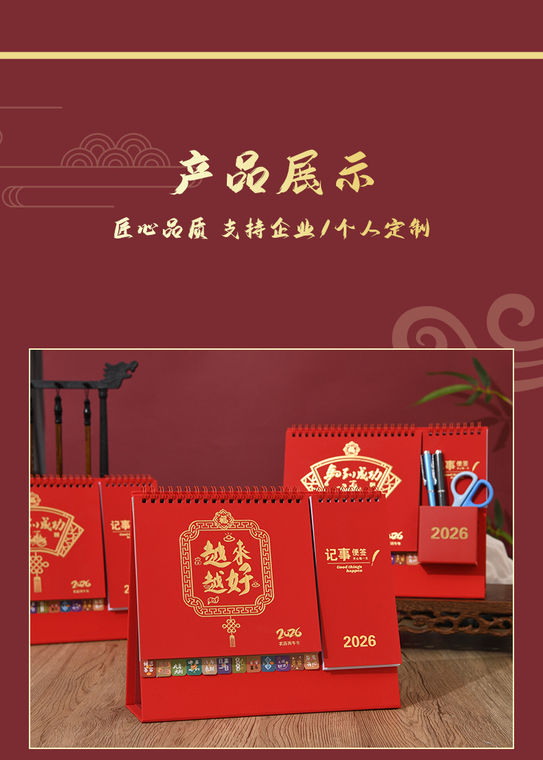 当前位置:主页 > 印刷品定制 > 宣传印品 > 画册类 > 台历 > 2026马年中国红笔筒便签台历式可记事办公定 制办公室桌面