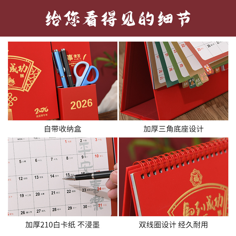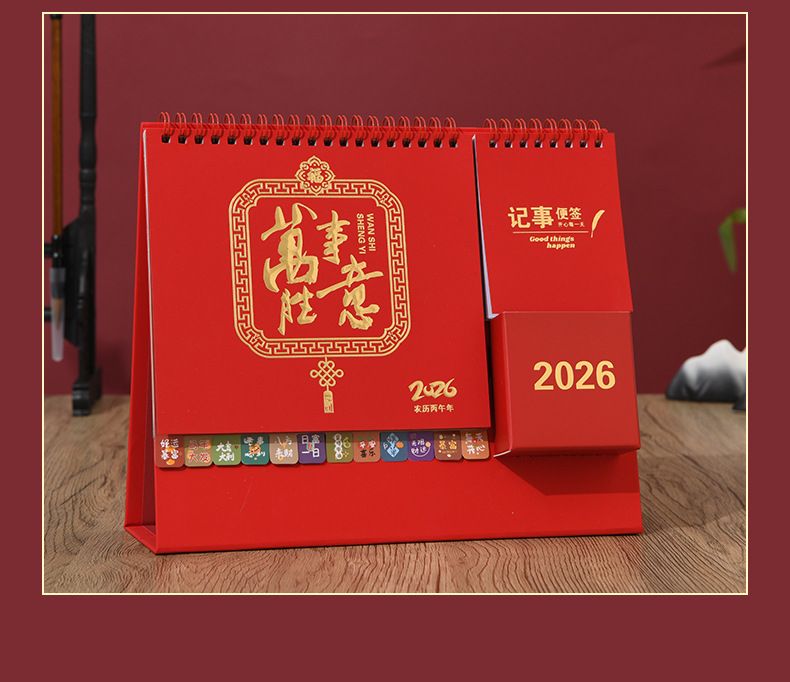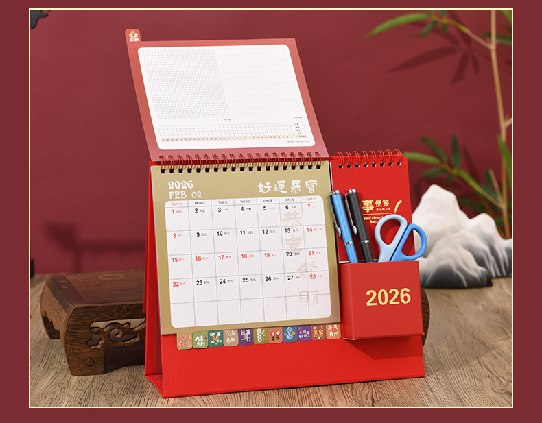 2026马年中国红笔筒便签台历式可记事办公定 制办公室桌面