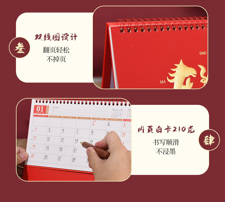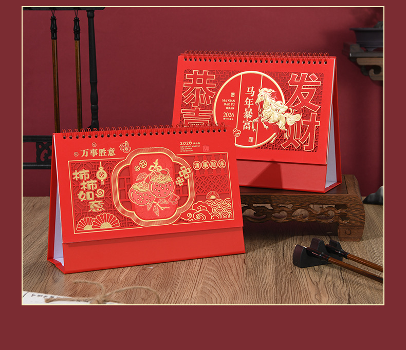 2026马年金雕台历厂家直销商务企业办公 记事打卡中国红定 制台历